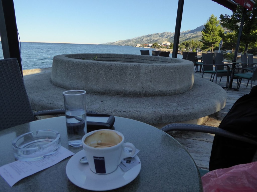 Richtig: für das 10-Euro-Frühstück war ich in Anbetracht der unangemessenen Übernachtungskosten zu geizig. Ich hatte noch ein Brötchen und Käse aus Montenegro im Gepäck (jaja, weiß ich selbst, in Montenegro war ich vor 3 Tagen). Den Kaffee dazu gab es gleich am Ortausgang von Starigrad an der Jadranska.