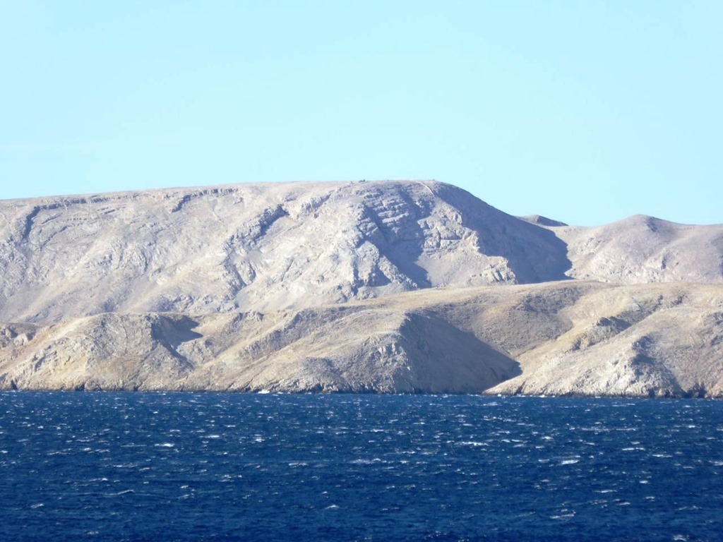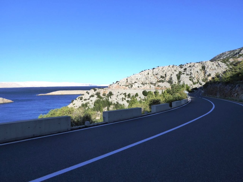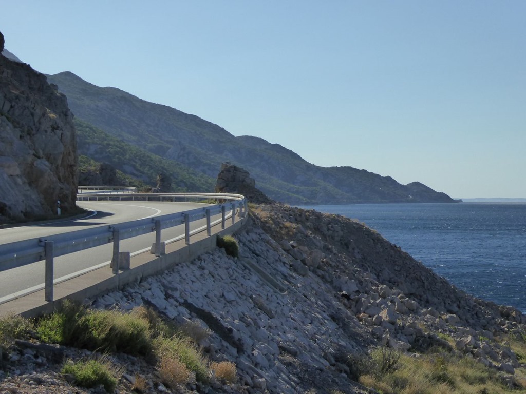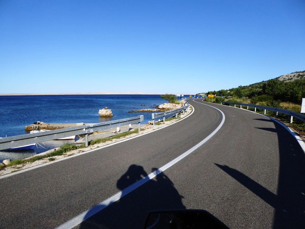 Auf die folgenden 30 Kilometer bis Karlobag habe ich mich gefreut, sind es doch die landschaftlich schönsten und fahrerisch anspruchsvollsten der gesamten Adriaküste. Leider machte mir die Bora einen Strich durch die Rechnung (Bora oder Bura kommt von Boreas, griechischer Gott der Nordwinde). Die für diese Region jahreszeittypischen Fallwinde machen Schräglagenfahrten zu einer riskanten Angelegenheit. Einmal war der Windstoß so stark, dass das Motorrad mit mir angehoben und in der Luft über die andere Straßenseite in Richtung Adria geschoben wurde. Glücklicherweise gab es um diese frühe Zeit noch keinen Gegenverkehr! Nur durch die mir eigene herausragende Reaktionsfähigkeit konnte ich Kati und mich noch im Fluge mittels eines sehr speziellen Manövers wieder auf unsere Straßenseite zurückbefördern.