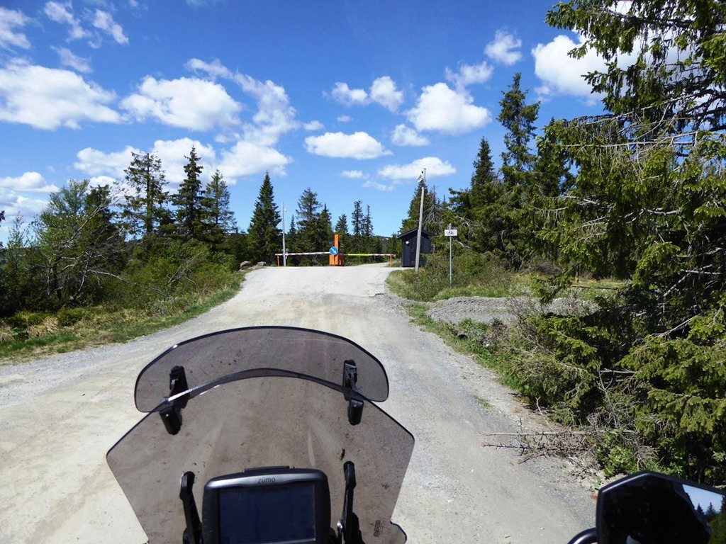 Der Eingang des Peer-Gynt-Weges, Autofahrer müssen 80 Kronen(ca. 8 €) Maut zahlen, Motorradfahrer dürfen so durch