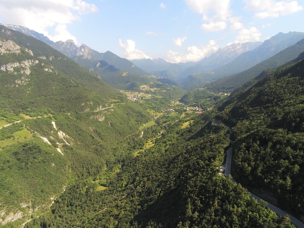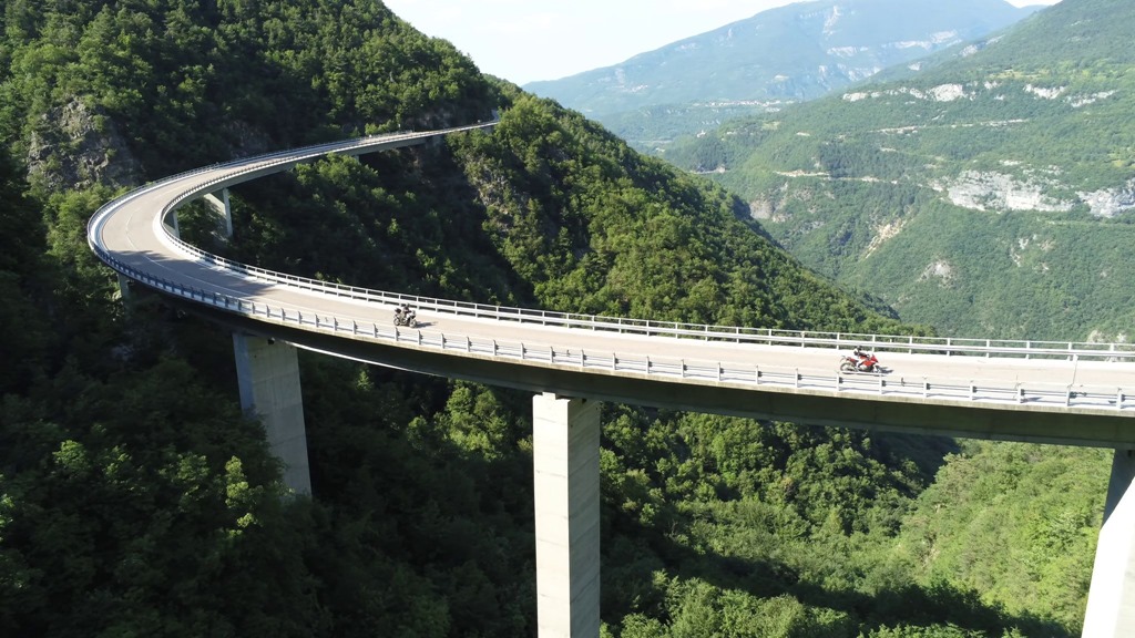 Aus der Drohnenperspektive sind die beiden Straßen an den gegenüberliegenden Hängen gut zu erkennen – ein Biker-Paradies
